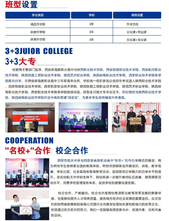 多样化升学实现因材施教:学校开设凌云班、航天班、重点班、体育升学班、职教本科班、3+3定向升学班。在班级设置及升学规划方面,我校因材施教,精准规划,结合不同学生学习能力和学习潜质,量身定制升学方案,确保每一个学生都能找到最优升学方向,真正实现择己所长。