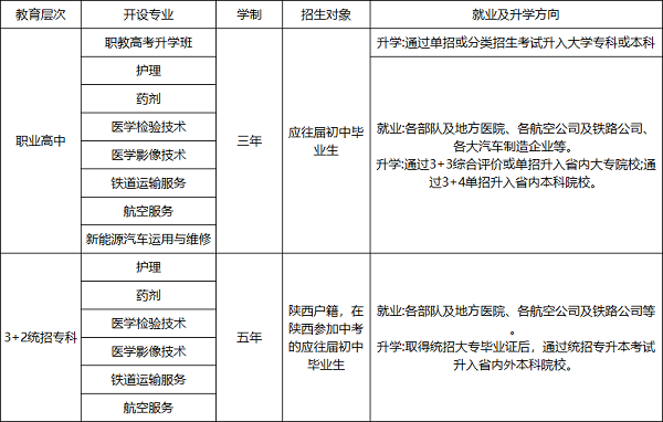 自1994年建校以来,学校已发展成为规模大、师资力量强,设备先进的中、高等职业人才的培养基地,现设有护理、药剂、医学检验技术、医学影像技术、铁道运输服务、航空服务、新能源汽车运用与维修7个热门专业。学校于2002年经陕西省教育厅、陕西省卫生厅联合组织专家评估认定我校为“医药卫生类专业指定招生院校”,毕业生有资格报考职业资格证考试。2008年经西安市教育局专家组评估,我校被评为“西安市重点学校”,2009年被省教育厅评估为“陕西省示范学校”。