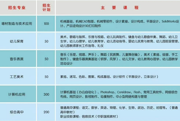 学校开设有增材制造与技术应用、幼儿保育、音乐表演、工艺美术、计算机应用、无人机操控与维护等专业。按照省一类标准,配备了先进的现代化教学设备,建有专业实训基地。近年来,学校累计投资一千多万元,大力改善办学条件,提升学校办学水平。建成了数字化校园和云计算机网络平台,西沃智慧黑板的投入使用为教育信息化增光异彩,打造互动式课堂教学。增添了技能大赛实训设备,完成了暖气工程和标准化食堂改造,更换了师生办公桌椅和课桌凳。学校的设施设备、办学条件、校容、校貌得到了显著改善,为师生打造了一个良好的工作、学习环境。学校坚持以就业与升学并重的办学思路,学生就业前景良好,教育教学稳步提高。