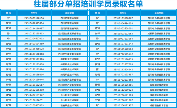 摘要:成都星空单招培训学校自2016年开始从事单招培训,是四川较早的单招考前培训机构之一,自成立以来,我校升学率方面也获得了学员的广泛认可,通过我们的教学,单招学生被公办院校录取率达96.8%。 涨分热线:18980784372(周老师)~ 往年单招(部分)录取情况: 星空